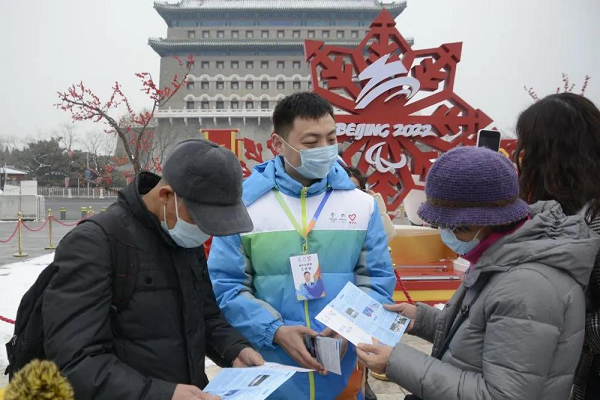 ▲王興(左二)在北京前門(mén)步行街為游人講解冬奧場(chǎng)館