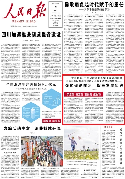 《人民日?qǐng)?bào)》頭版:中管企業(yè)、中管金融企業(yè)扎實(shí)開(kāi)展學(xué)習(xí)貫徹習(xí)近平新時(shí)代中國(guó)特色社會(huì)主義思想主題教育——強(qiáng)化理論學(xué)習(xí) 指導(dǎo)發(fā)展實(shí)踐(學(xué)思想 強(qiáng)黨性 重實(shí)踐 建新功)